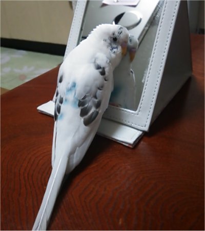 太郎は鏡が大好きで、放鳥中はほとんど鏡の前で過ごす